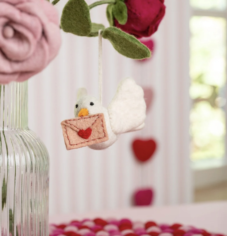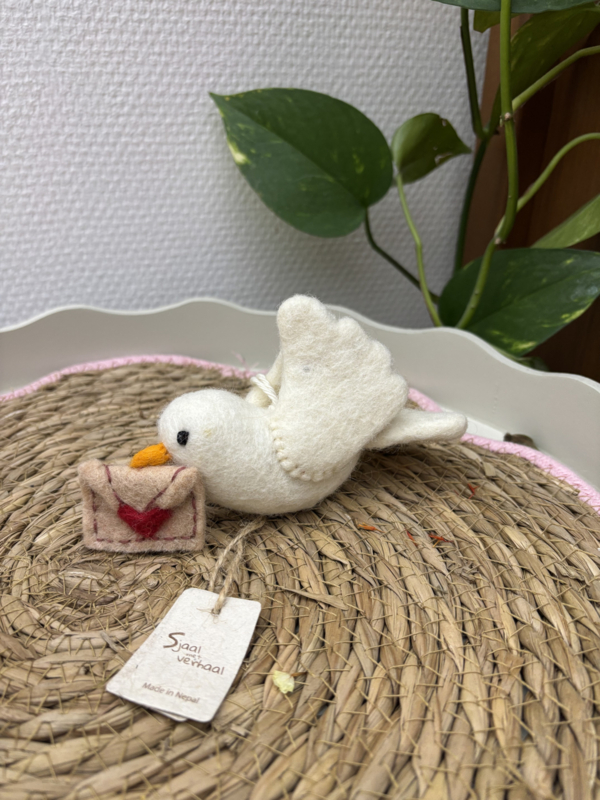 Deze duif met een envelopje in de snavel is handgemaakt voor Sjaal met Verhaal door vrouwen in Nepal.
