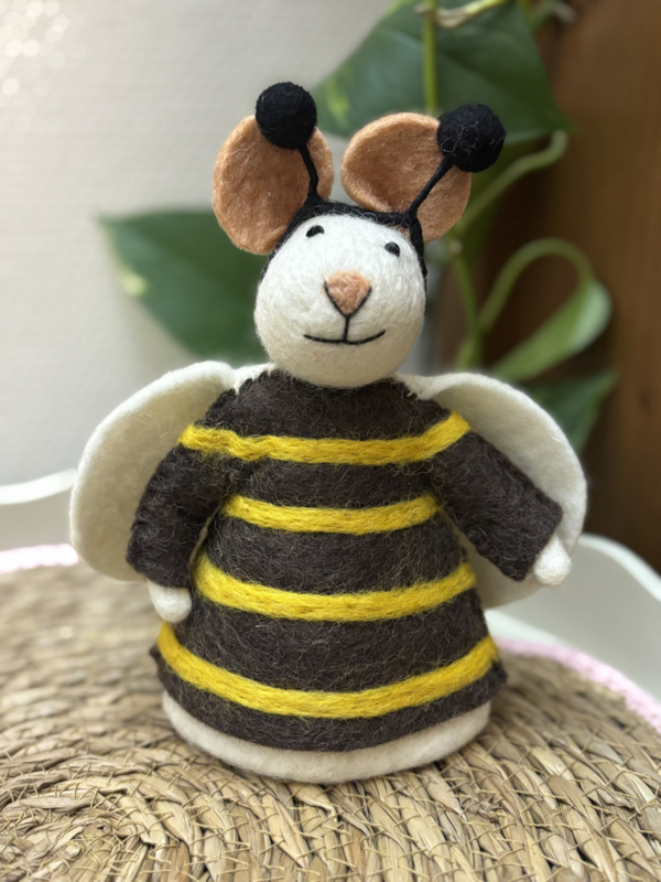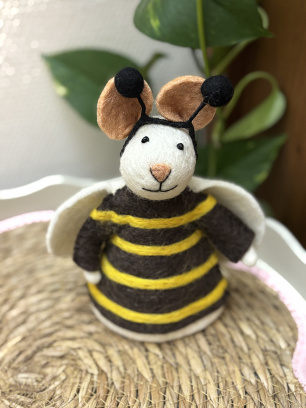 Vilten muis verkleed als bijtje. Leuk als decoratie in huis of als eiwarmer bij het ontbijt!
