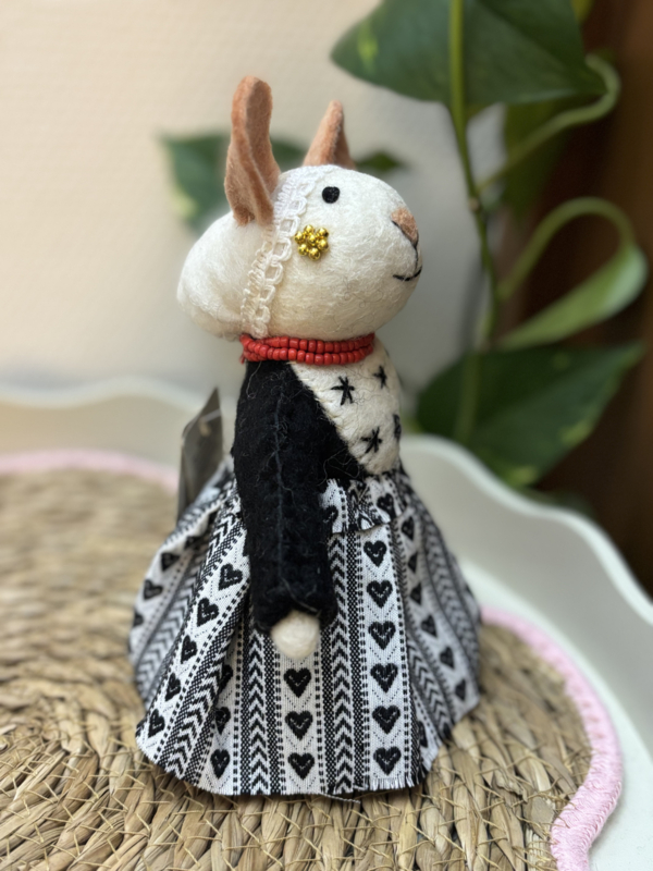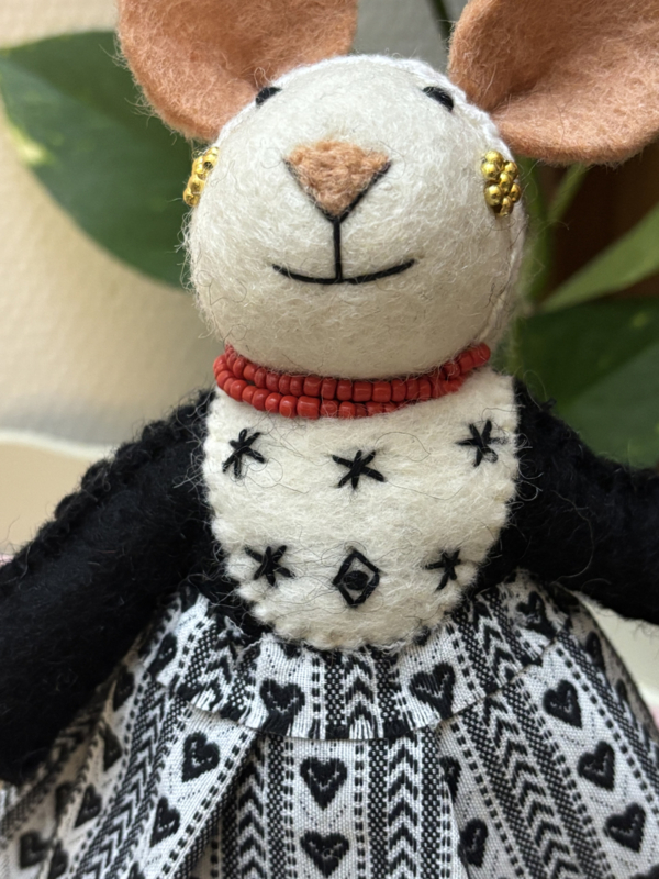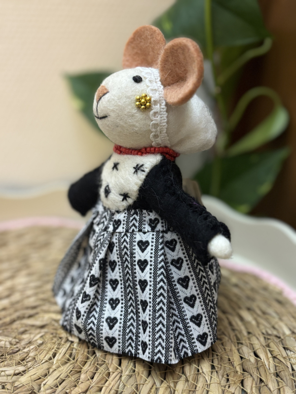 Zeeuws muisje van vilt in traditioneel kostuum. De prachtige details zoals het kralensnoer (in de echte klederdracht zijn dit bloedkoralen), kanten mutsje en zwartwit zeeuws schortenbont geven haar een unieke uitstraling. Een ode aan Zeeland, perfect als decoratief cadeau of verzamelitem.