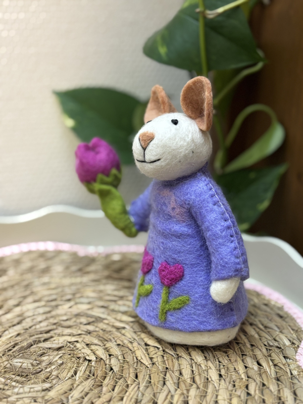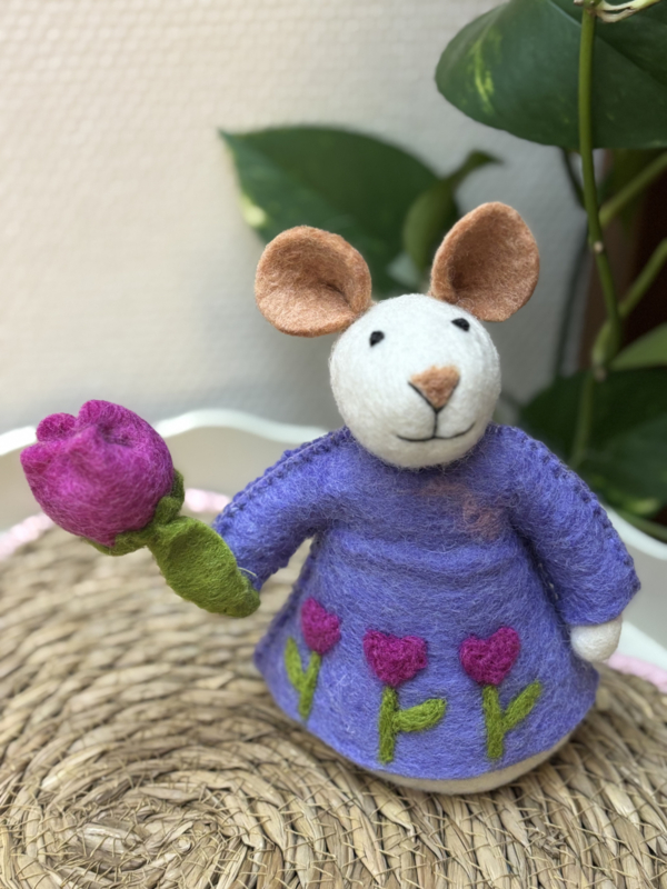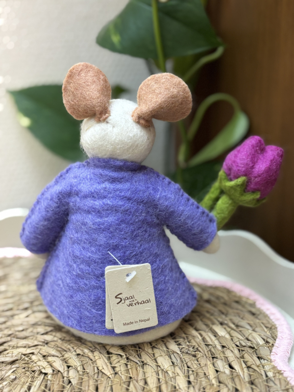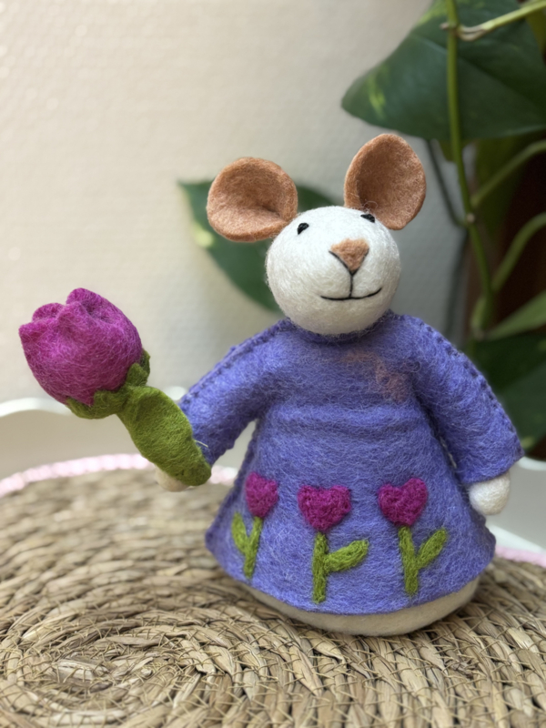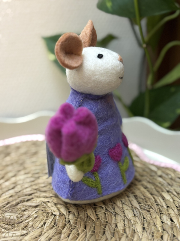 Decoratie muis in het paars met een tulp in zijn hand . Deze lieve vilten muis met een tulp heeft een vrolijke en unieke uitstraling aan je interieur. Leuk als decoratie of als cadeautje.