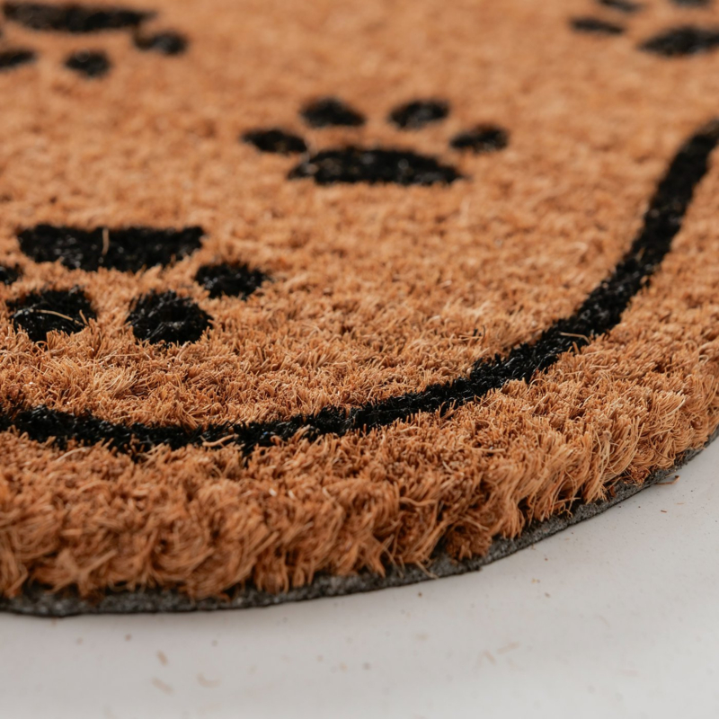 Deze deurmat in de vorm van een hondenbot heeft allemaal Hondenpootjes erop gedrukt.