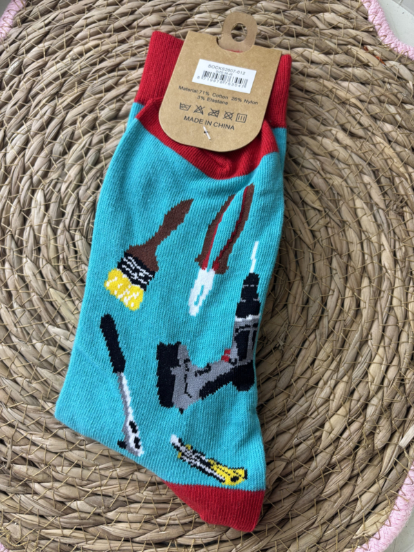 Sokken van het merk Musthaves met afbeeldingen van gereedschappen erop.