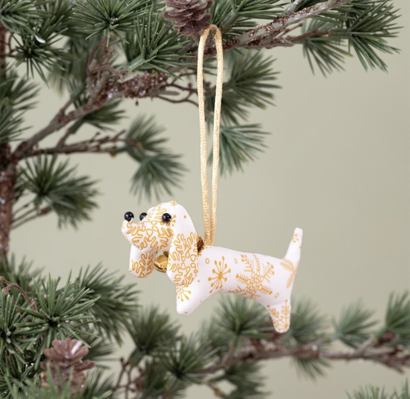 Teckel hanger van witte stof met sneeuwvlokjes erop geprint. De teckel heeft een halsband om met een belletje eraan.